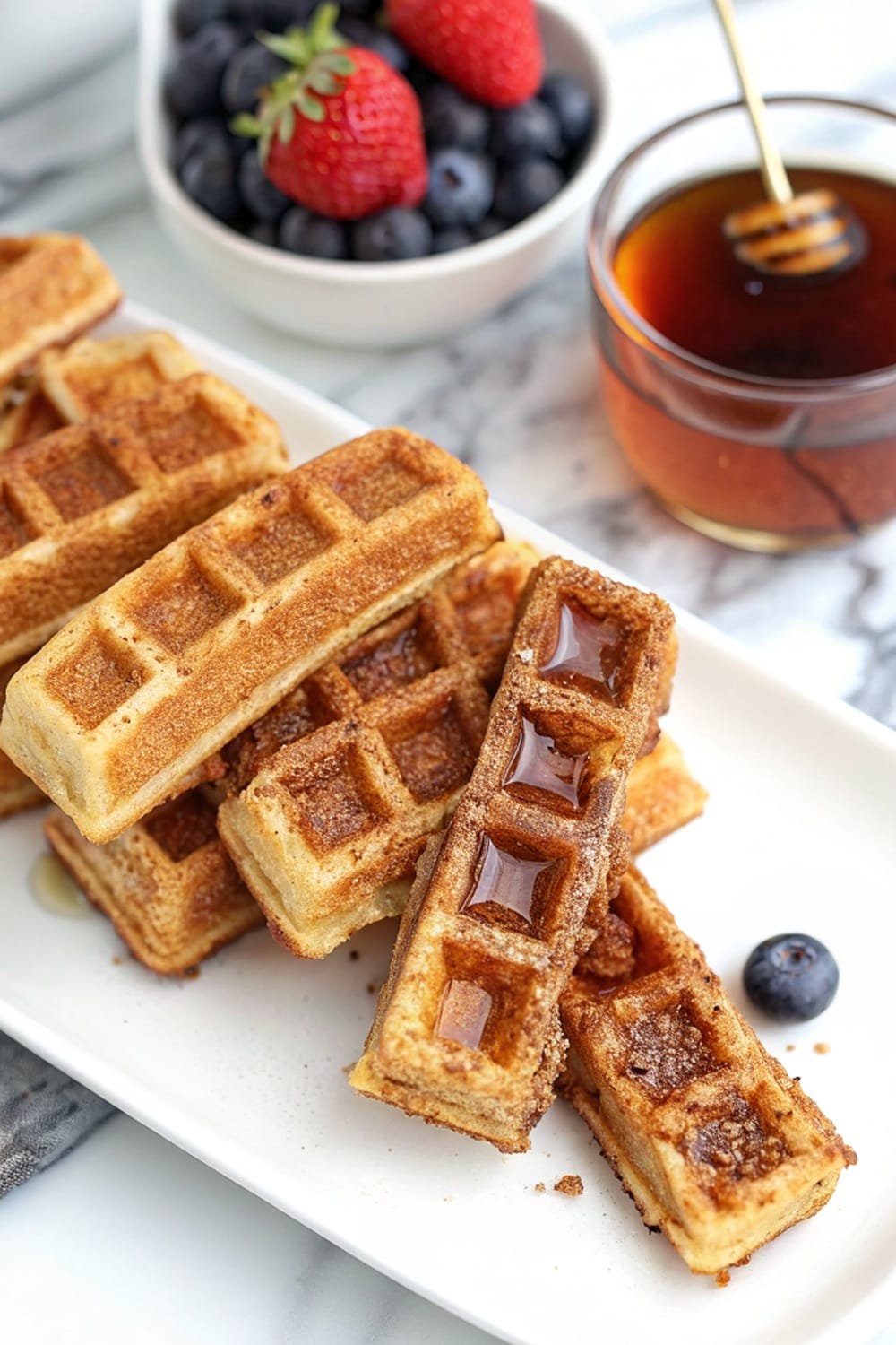 - Cook waffles in a waffle maker, then cut them into sticks.