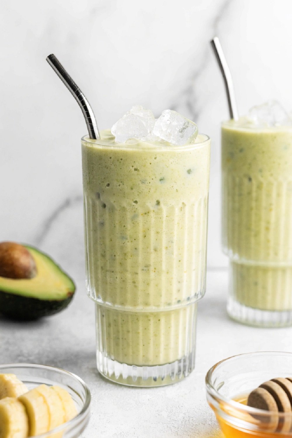 Prepare the Fruit: Cut the avocado in half, remove the pit, and scoop the flesh into the blender. Slice the bananas into chunks so they blend more easily. If using frozen banana slices, no thawing is needed.
