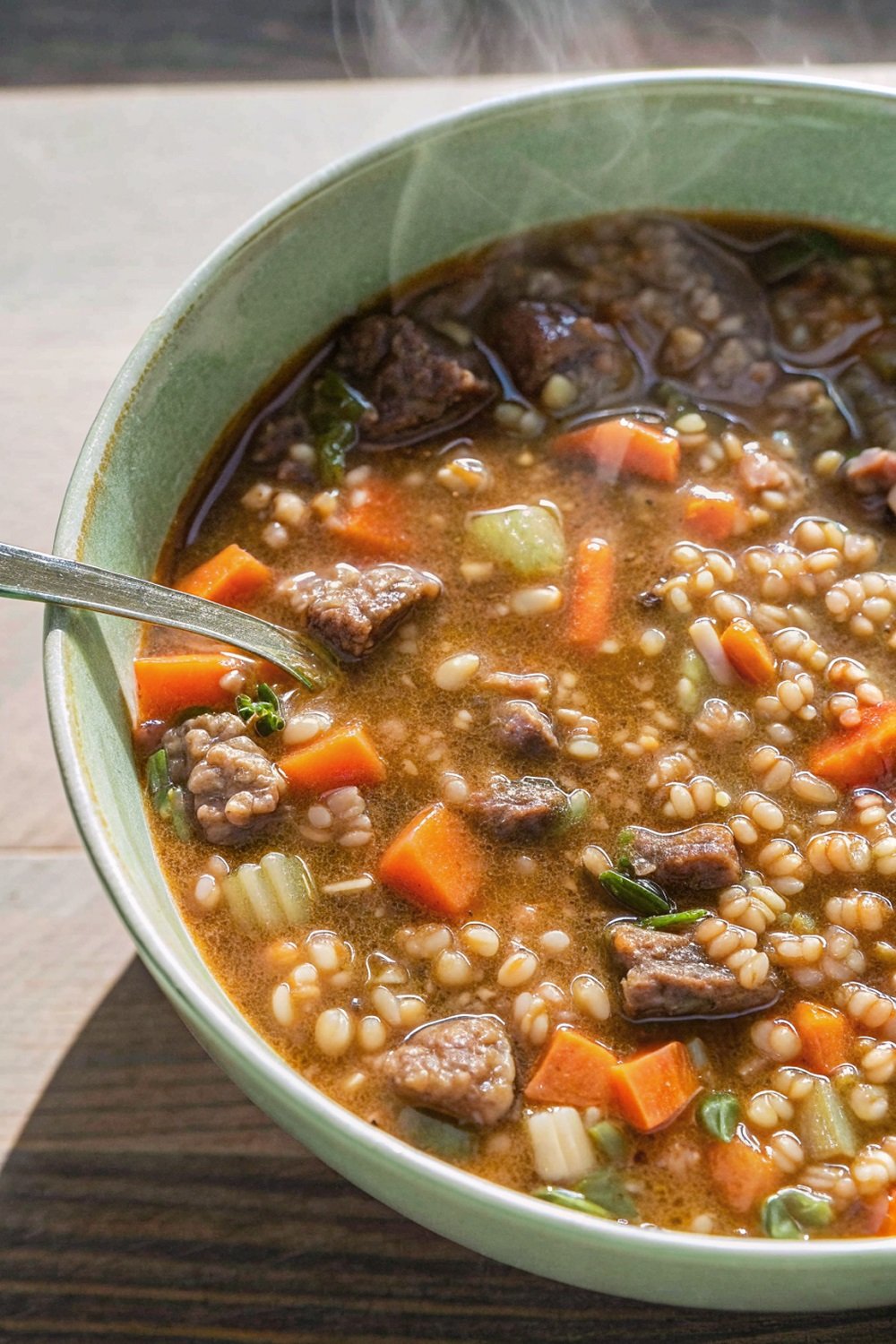 Tender beef and hearty barley simmered in a rich savory broth.