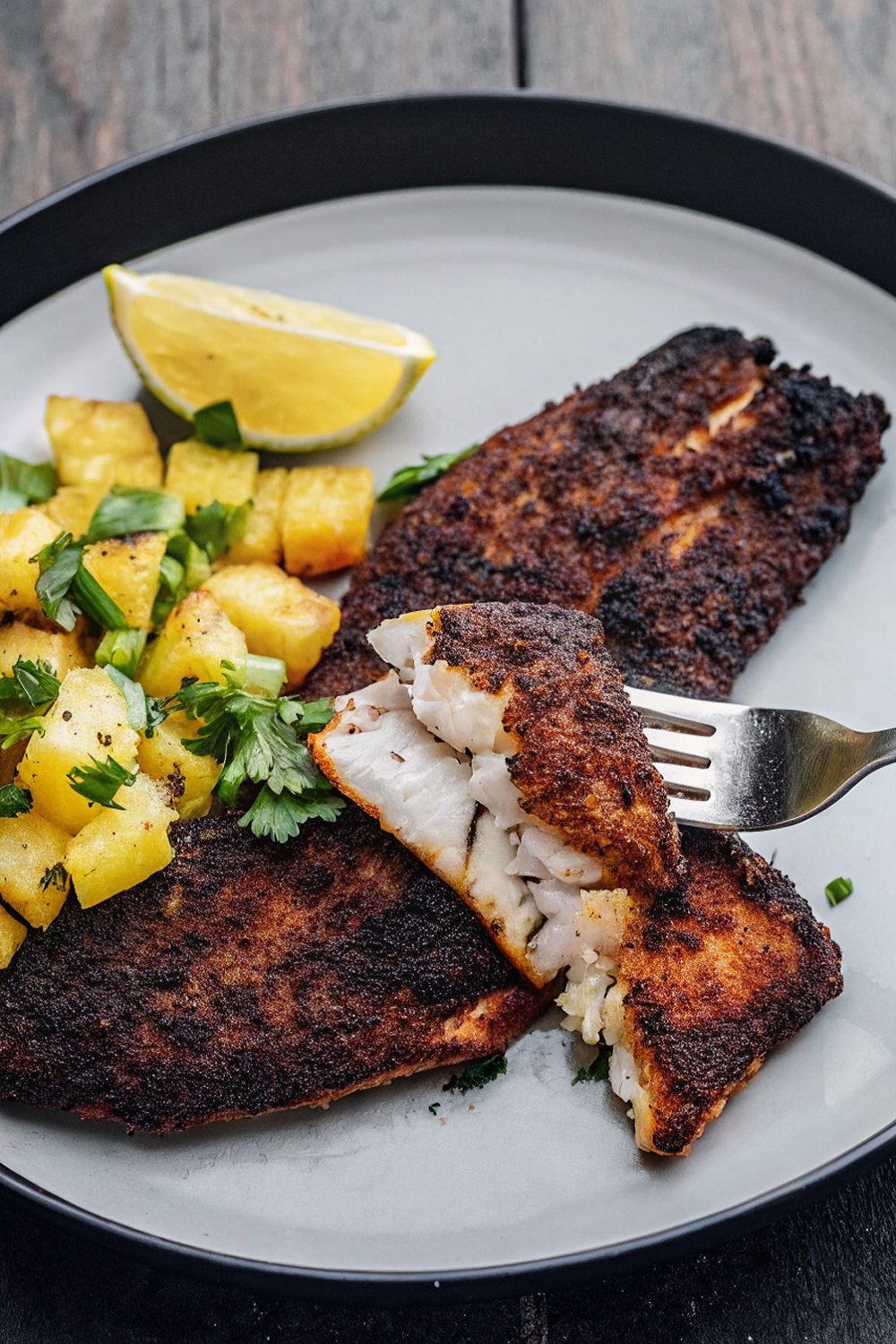 Season Generously: Sprinkle the spice blend evenly over both sides of each fillet. Press gently with your fingers so the spices stay in place. The coating should look dark and well covered.