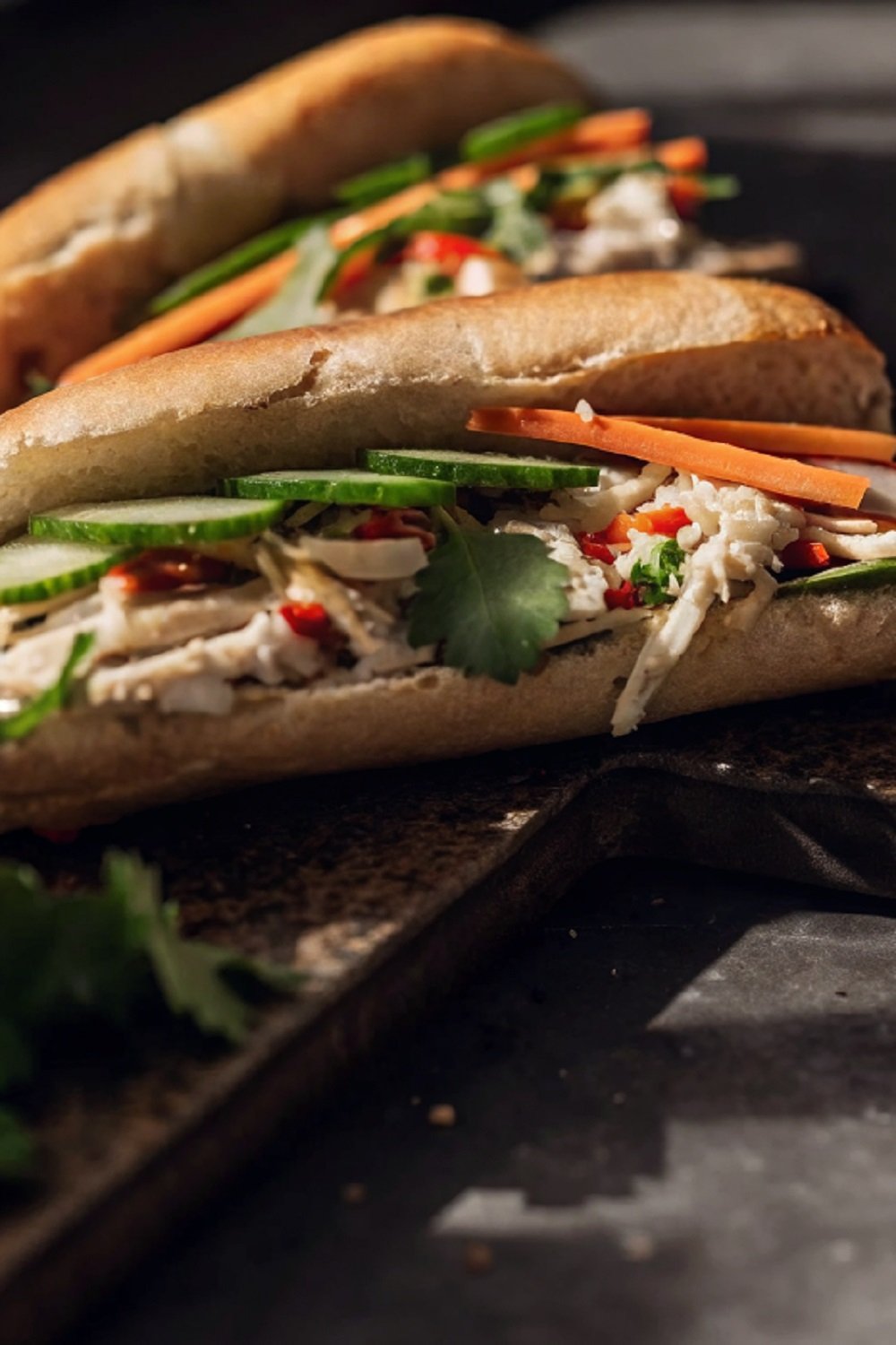 Build the Sandwich: Layer the seasoned chicken inside each roll. Add pickled vegetables, cucumber slices, green onion, and fresh coriander on top.