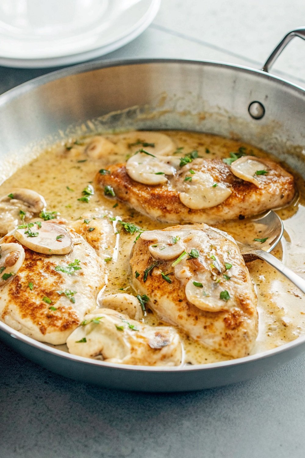 Finish and Serve: Return the chicken to the pan and spoon sauce over the top. Sprinkle with fresh parsley and let everything warm together for a minute before serving.