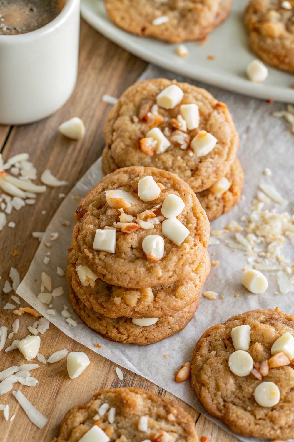 Fold in Coconut and Nuts: Add chopped macadamia nuts and shredded coconut. Stir carefully so they spread evenly through the dough. This step ensures every cookie carries texture and flavor in each bite.