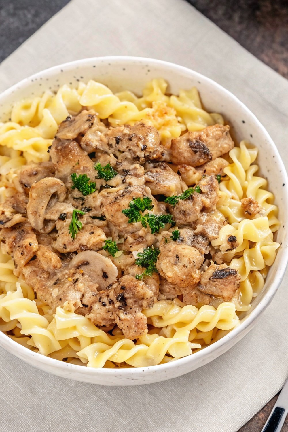 Pour in the Cream: Lower the heat slightly and pour in the whipping cream. Stir slowly so it blends with the sausage and mushrooms. Let it simmer for a few minutes until the sauce thickens.