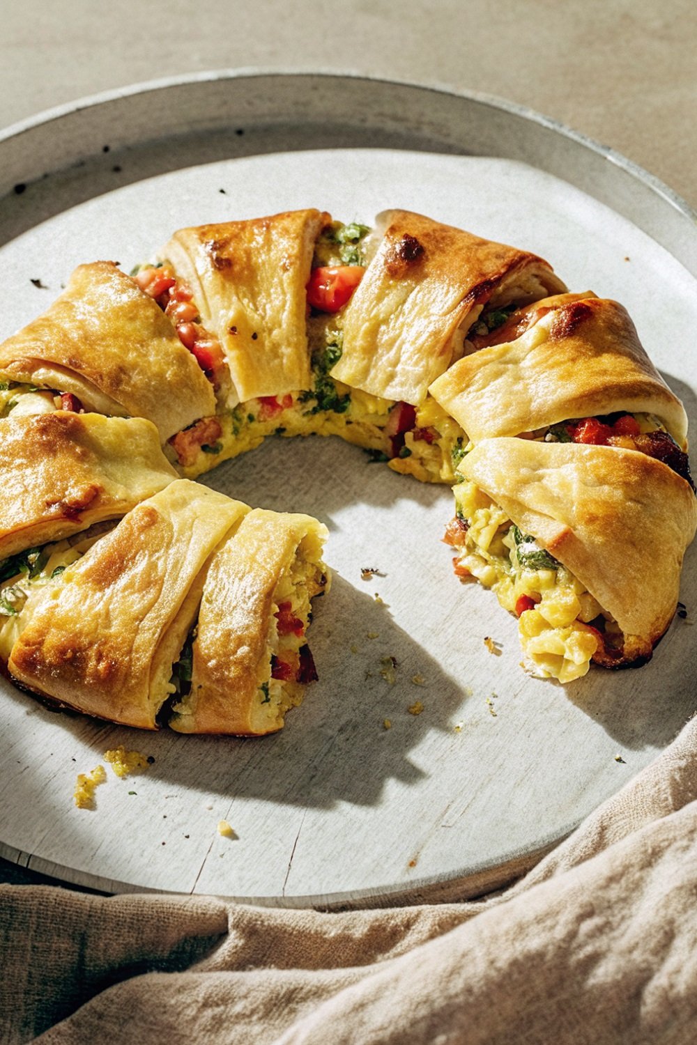 Fill the Ring: Spoon the egg mixture evenly around the center of the ring. Sprinkle shredded cheddar cheese over the eggs so each slice gets plenty of melted goodness. Try to keep the filling close to the center to make folding easier.
