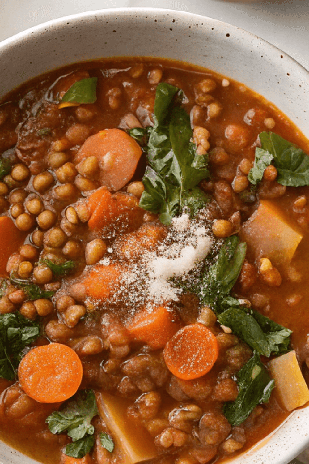 A hearty, flavor-packed slow cooker stew made with lentils, tomatoes, herbs, and greens.