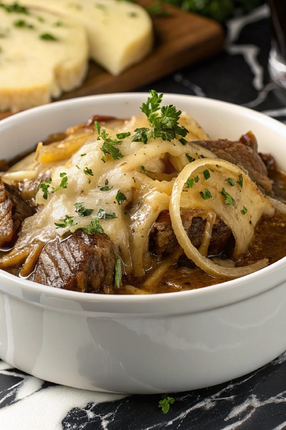 - Pour in broth, Worcestershire sauce, and thyme, then transfer to crockpot.