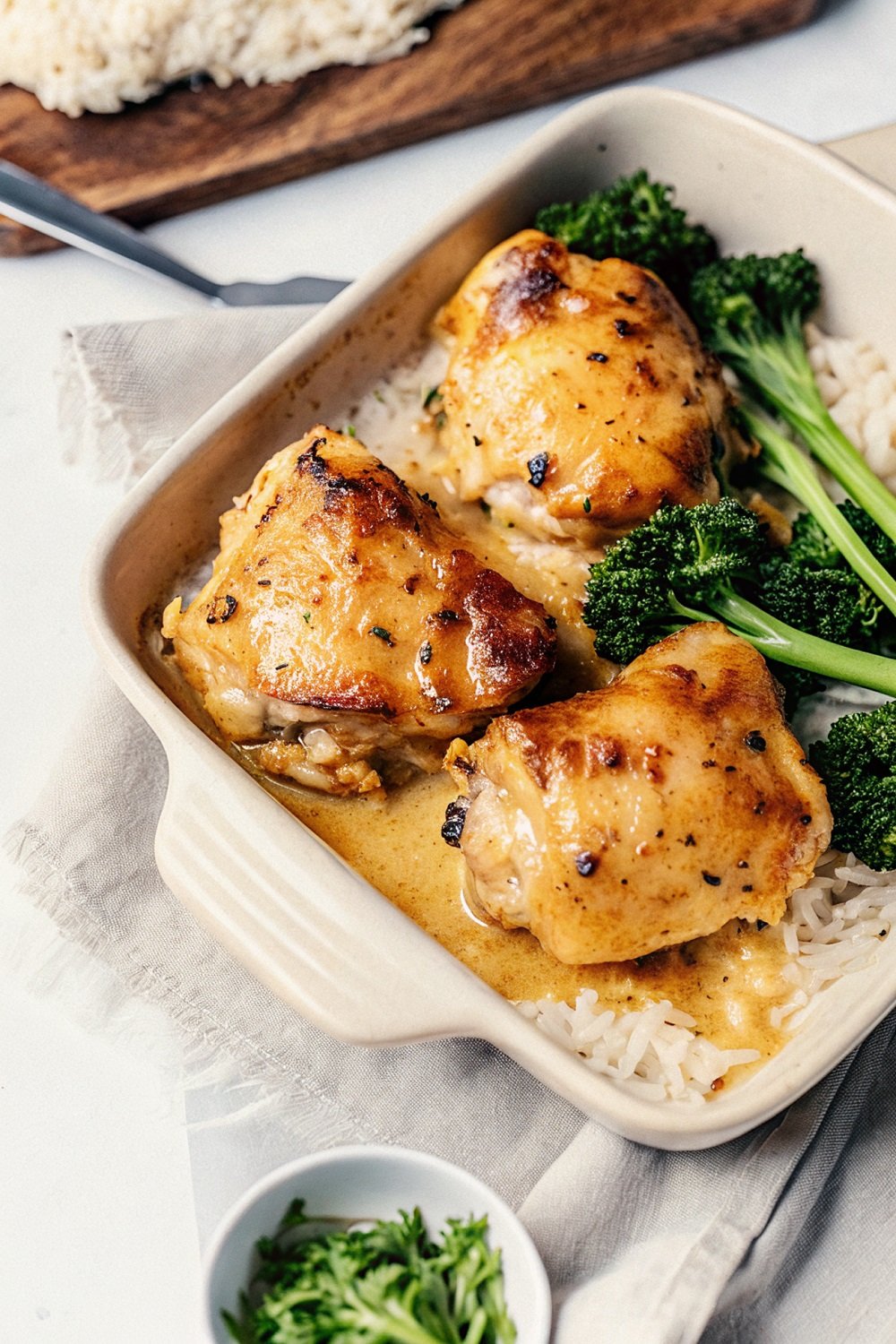 Assemble the Dish: Lightly brush a baking dish with olive oil. Arrange the chicken thighs skin side up in a single layer. Spoon the Dijon sauce generously over each piece, making sure some sauce reaches underneath the chicken as well. This keeps everything moist during baking.