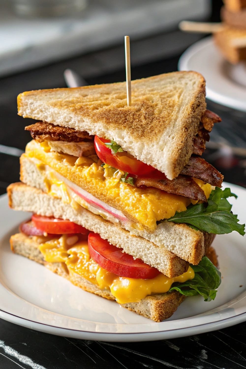 A hearty triple-layer sandwich with bacon, eggs, cheese, lettuce, and tomato, perfect for breakfast or brunch.