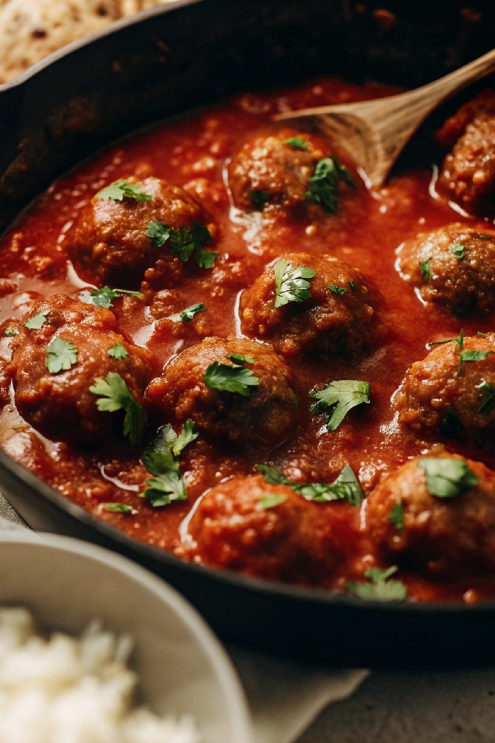 Finish with meatballs: Return meatballs to the pan and spoon sauce over them. Let everything simmer together until meatballs cook through and soak up flavor. Sprinkle chopped coriander on top before serving.
