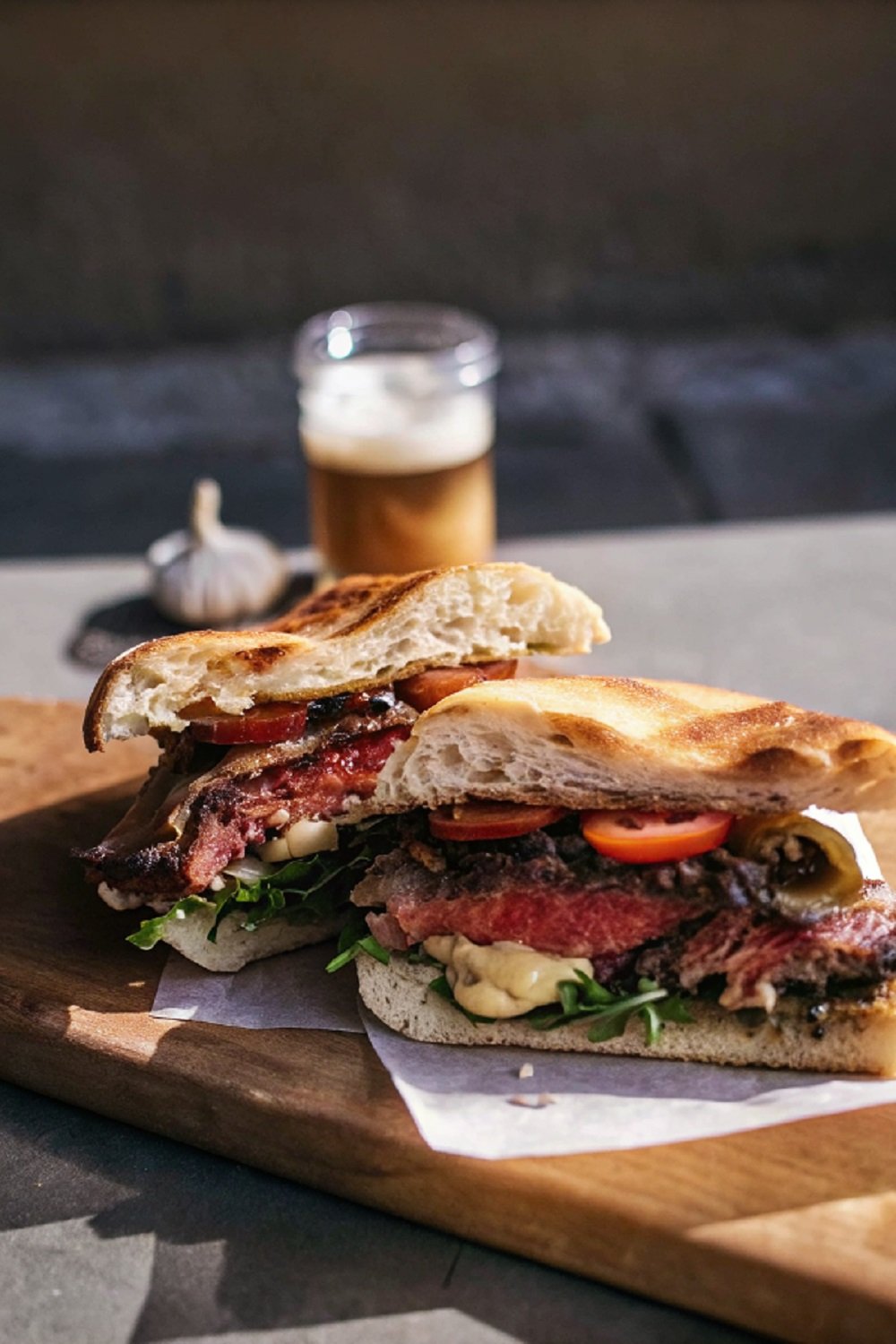 Assemble the Sandwich: Spread garlic mayo on the bread. Add sliced steak, caramelized onions, tomato slices, rocket, and a light swipe of mustard. Close the sandwich gently and slice to serve.