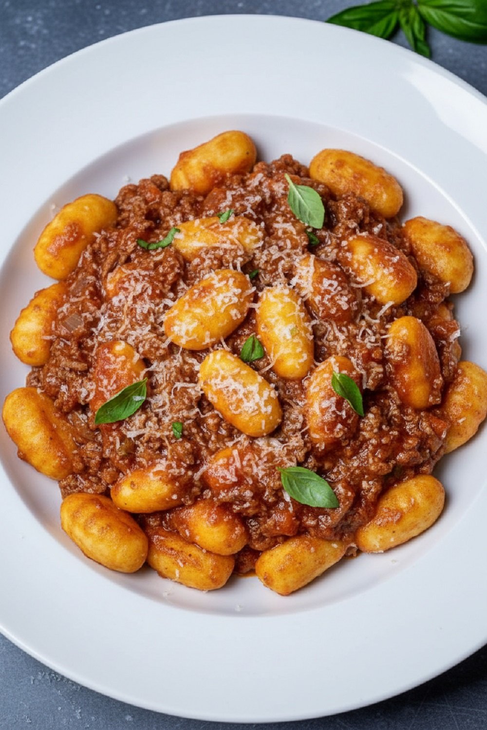 Drain and Combine: Carefully drain the gnocchi and transfer them straight into the simmering Bolognese sauce. Toss gently so each piece gets coated without breaking apart.