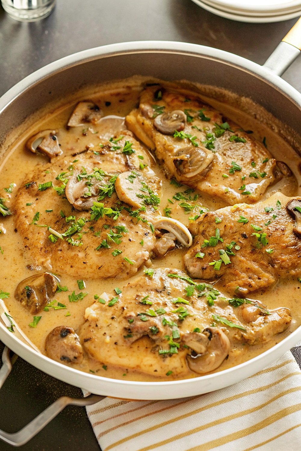 Tender chicken in a rich Marsala wine and mushroom cream sauce.
