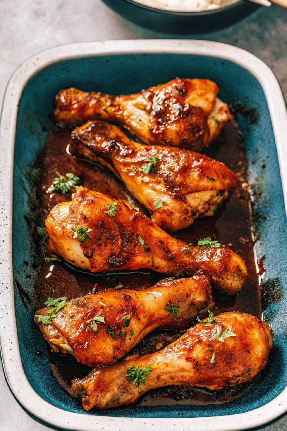 Simmer Until Tender: Cover the pan and let the chicken cook for twenty five to thirty minutes. Turn the drumsticks halfway and baste with sauce. The chicken should cook through and stay juicy inside.