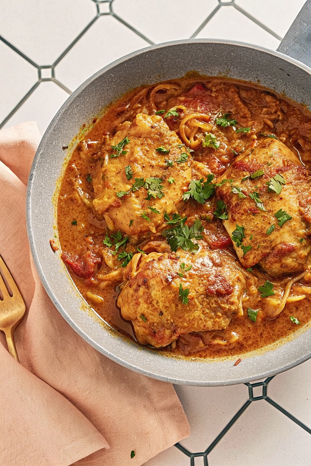 Tender chicken simmered in a rich paprika sauce finished with sour cream.