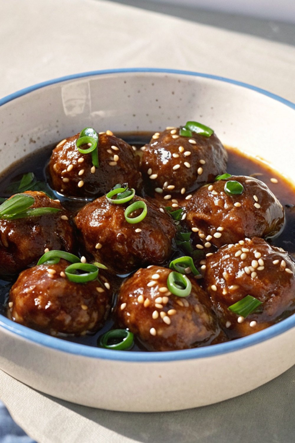 Finish with Garnish: Once the sauce clings nicely to the meatballs, remove the pan from heat. Sprinkle sesame seeds and sliced green onions over the top for a fresh and flavorful finishing touch.
