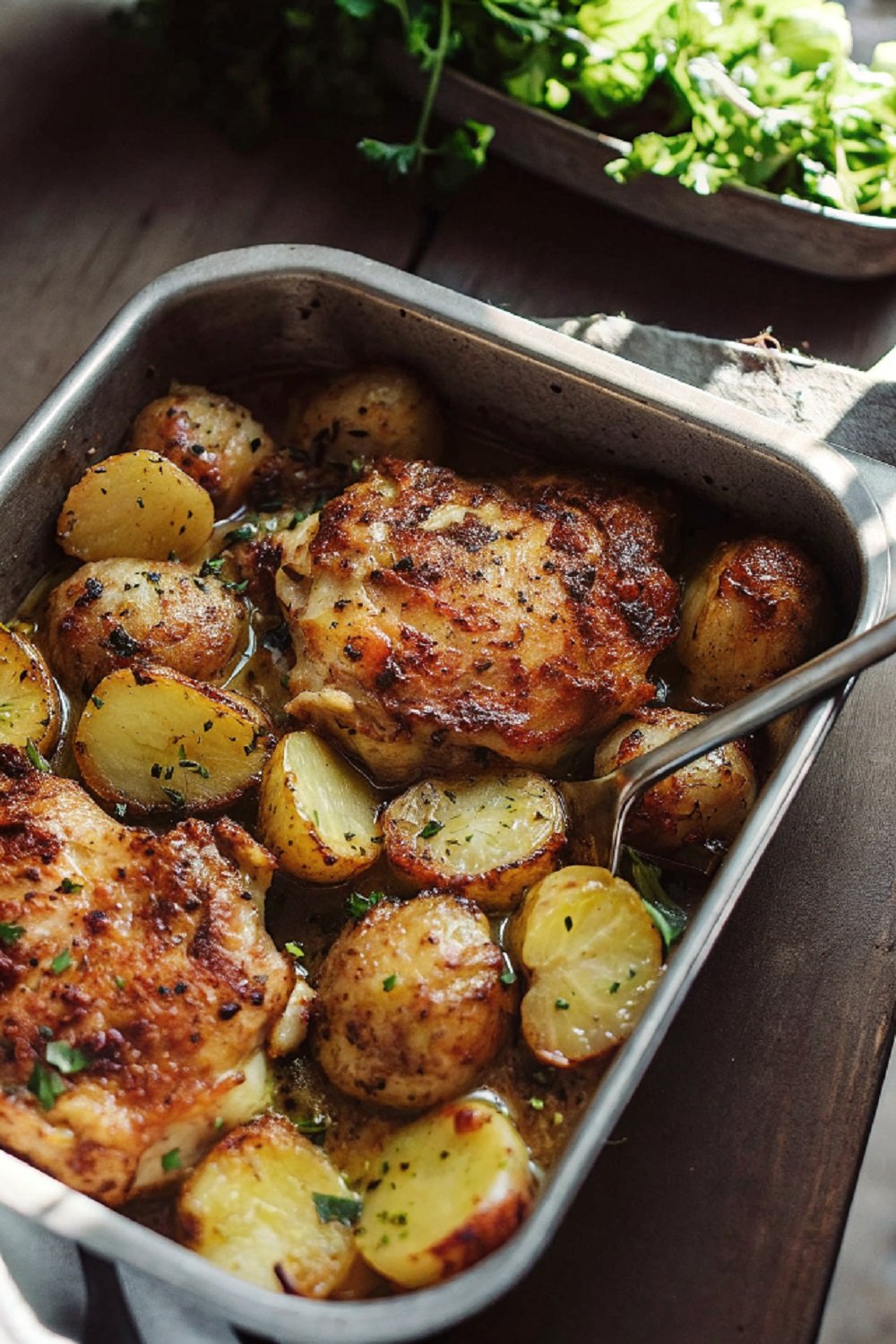 - Arrange chicken and potatoes in a baking dish.
