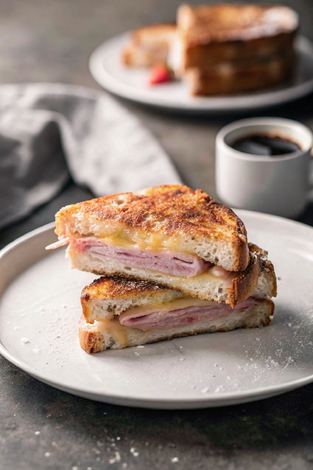Dip and Cook: Dip the assembled sandwich into the egg mixture, coating both sides evenly but not letting it soak too long or it will get soggy. Place the sandwich in the hot pan. Cook for 3–4 minutes per side until golden brown and the cheese is melted. Adjust heat as needed to prevent burning.