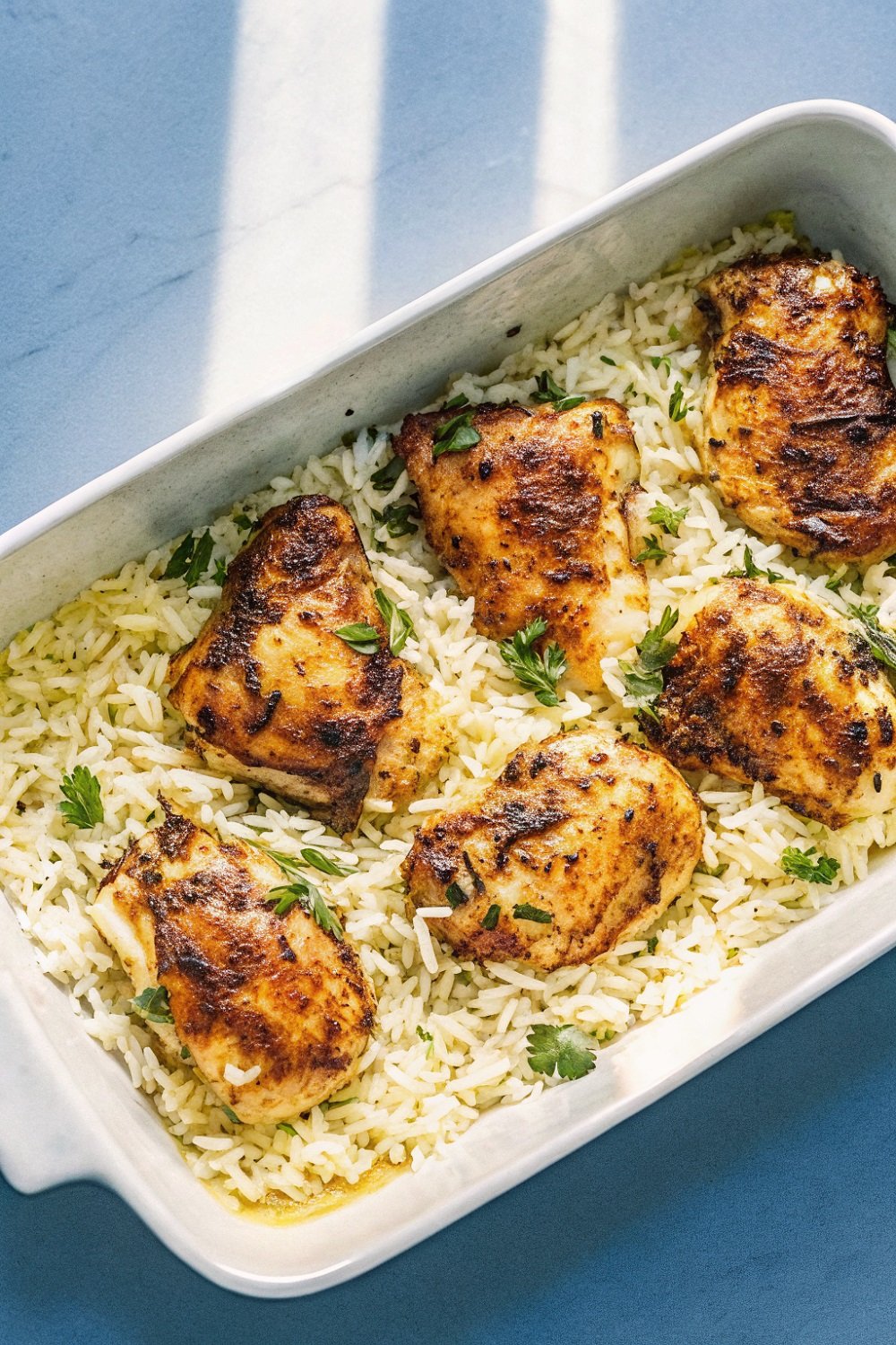 Arrange the Chicken: Lay the seasoned chicken pieces directly on top of the rice. Press them down slightly so the bottoms touch the liquid. This helps flavor the rice and keeps the chicken moist as it bakes.