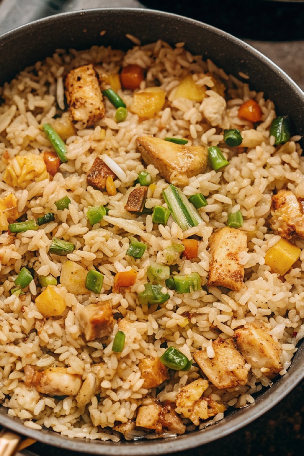 Prepare the Ingredients: Start by gathering and prepping everything before cooking. Dice the chicken into small, even pieces. Chop the onion, mince the garlic, and drain the pineapple well. Cold cooked rice works best since it stays firm and doesn’t turn mushy.