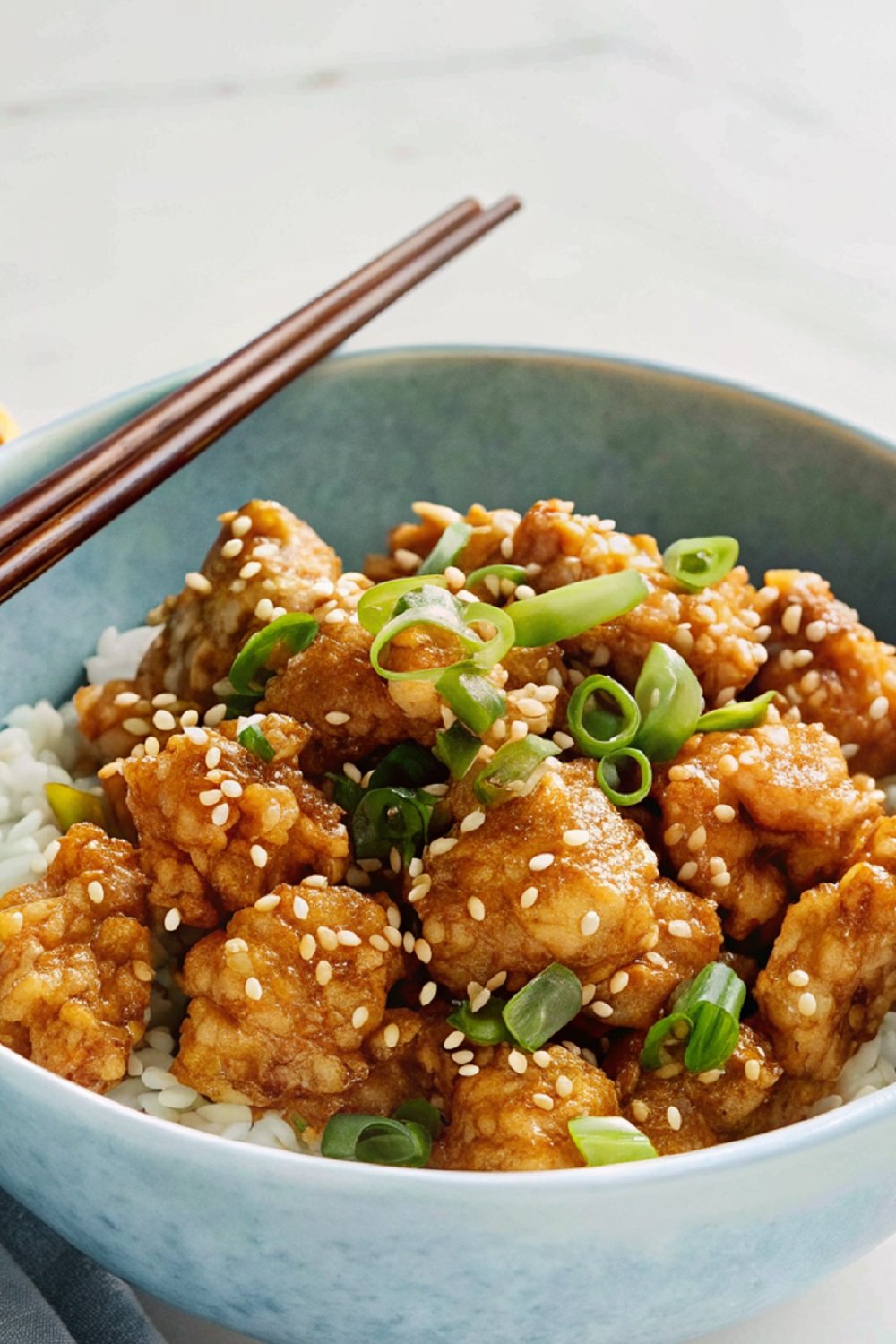 Finish and Garnish: Sprinkle sesame seeds and green onions over the chicken. Serve hot while the coating stays crisp.