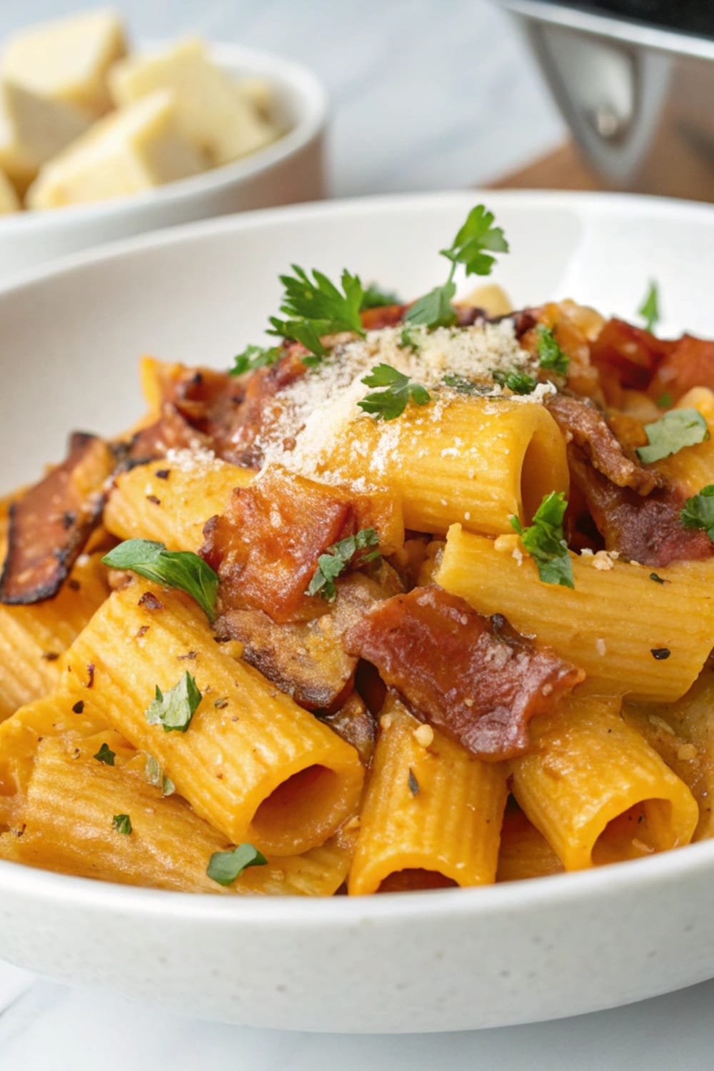 - Toss pasta with sauce, bacon, and reserved pasta water as needed.
