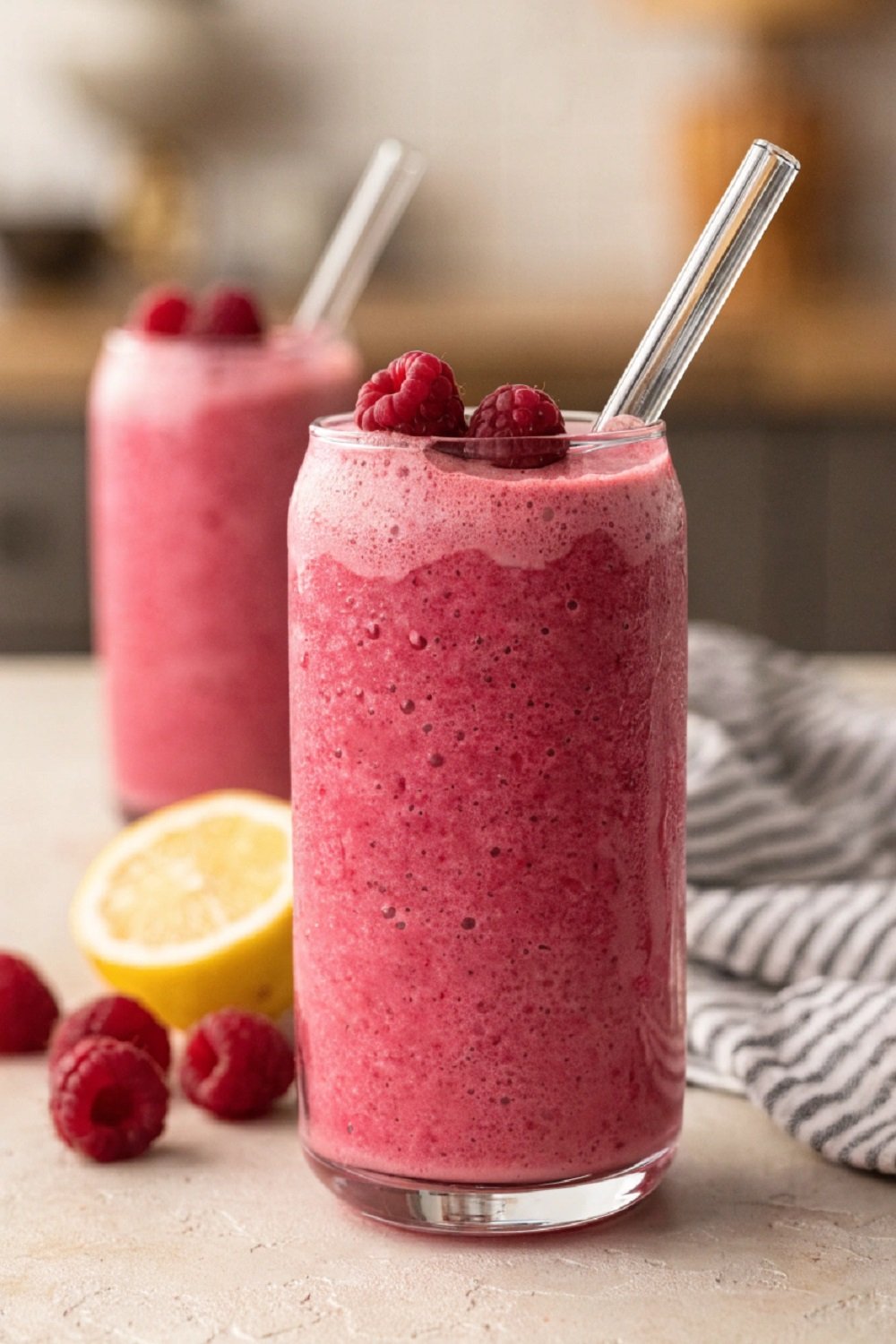 Prepare the Ingredients: Start by rinsing the raspberries gently if you are using fresh ones. Peel the banana and cut it into small pieces so it blends easily. Measure out the yogurt, milk, and sweetener so everything is ready before blending begins.