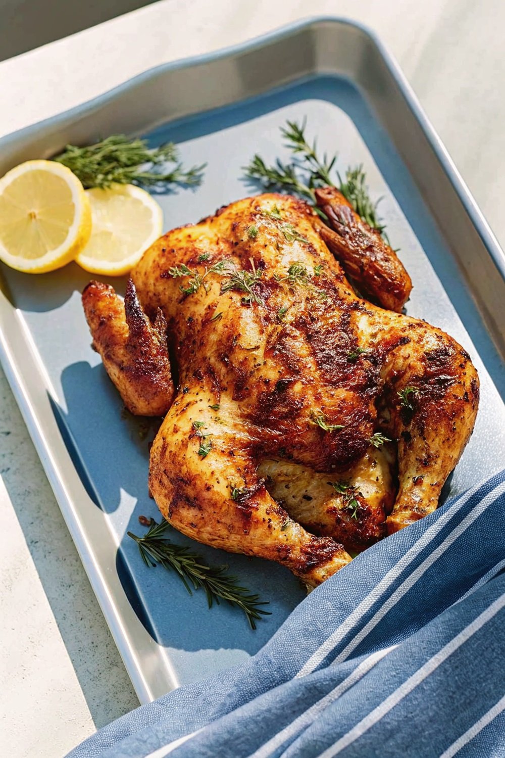 Roast Until Golden: Slide the pan into the oven and roast until the skin turns deeply golden and the meat cooks through. Because the chicken lies flat, it roasts faster and more evenly than usual.
