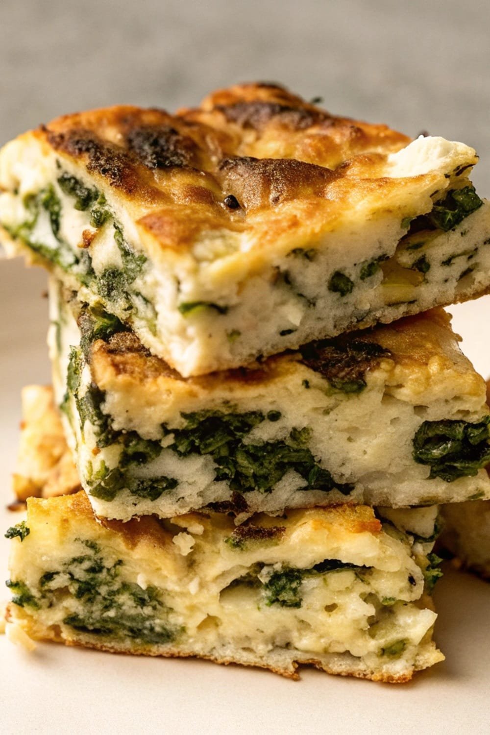 - Mix flour, salt, baking powder, eggs, milk, and butter. Stir in spinach, onion, and mozzarella.