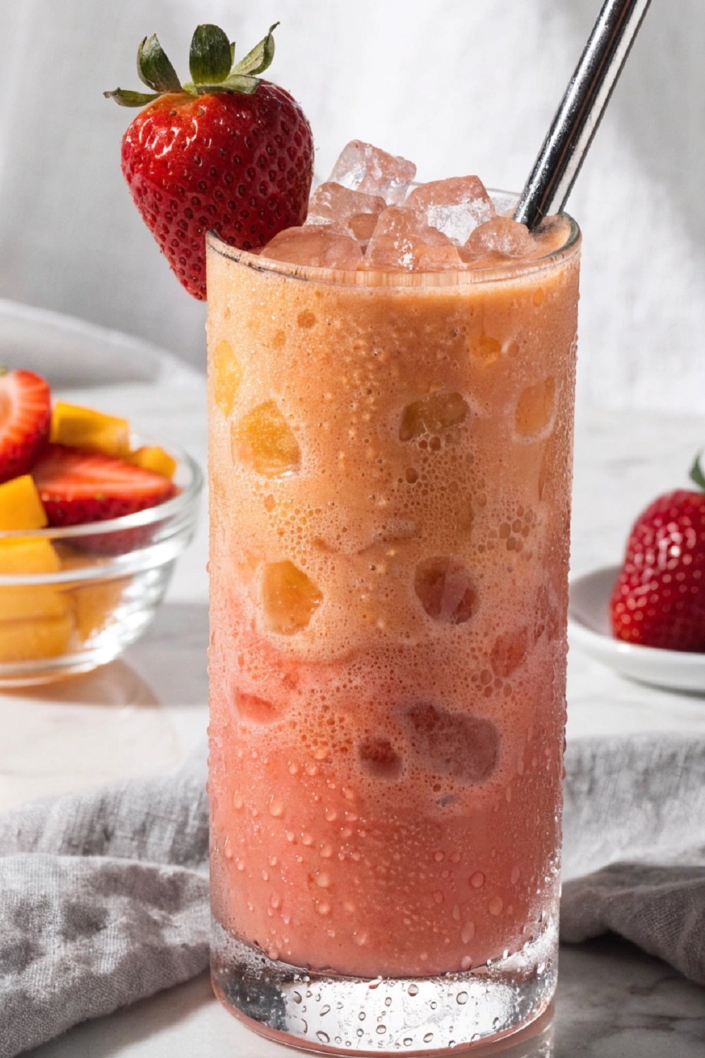 Prepare the Fruit: Wash the strawberries and remove the green tops before slicing them. Peel and cube the mango into small pieces so it blends easily and smoothly.