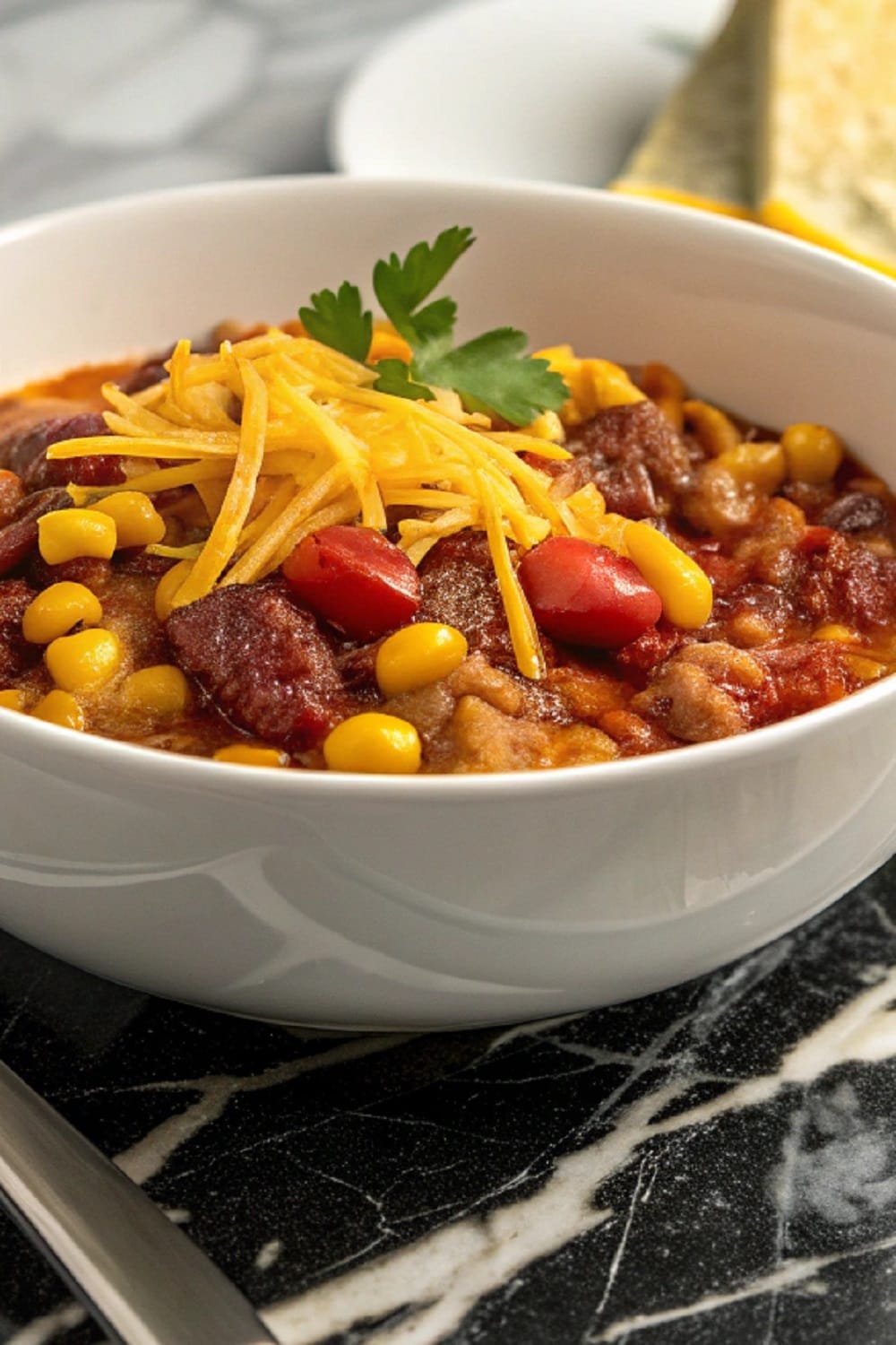 - Add seasonings, corn, beans, tomatoes, and sauce; stir well.