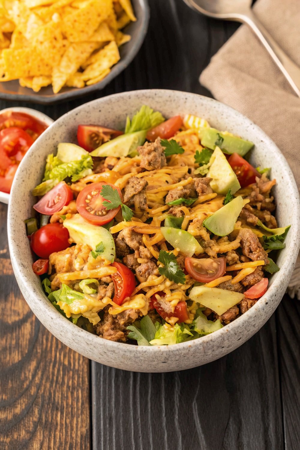 Assemble the Salad: Spoon the warm taco meat over the salad base. Spread it out gently so the heat slightly softens the cheese without wilting the lettuce too much. This step helps the flavors blend without losing crunch.