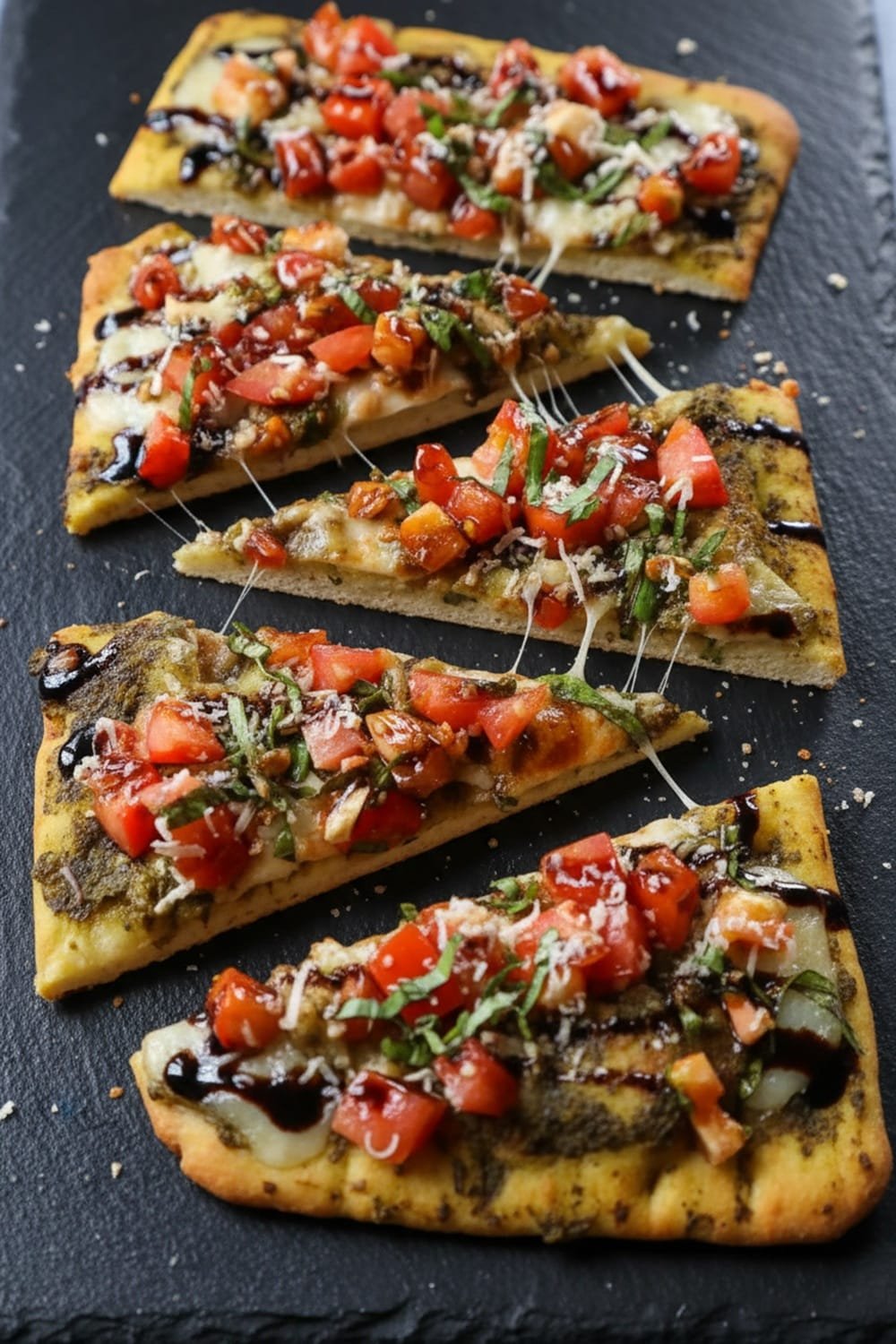 - Spoon bruschetta topping over hot flatbread.