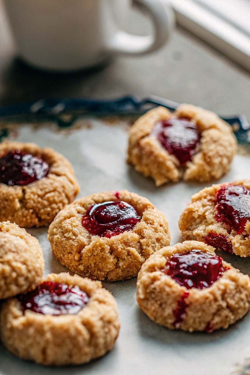 Create the thumbprint: Place the coated dough balls on the baking sheet. Use your thumb or the back of a spoon to gently press an indentation into the center of each cookie.