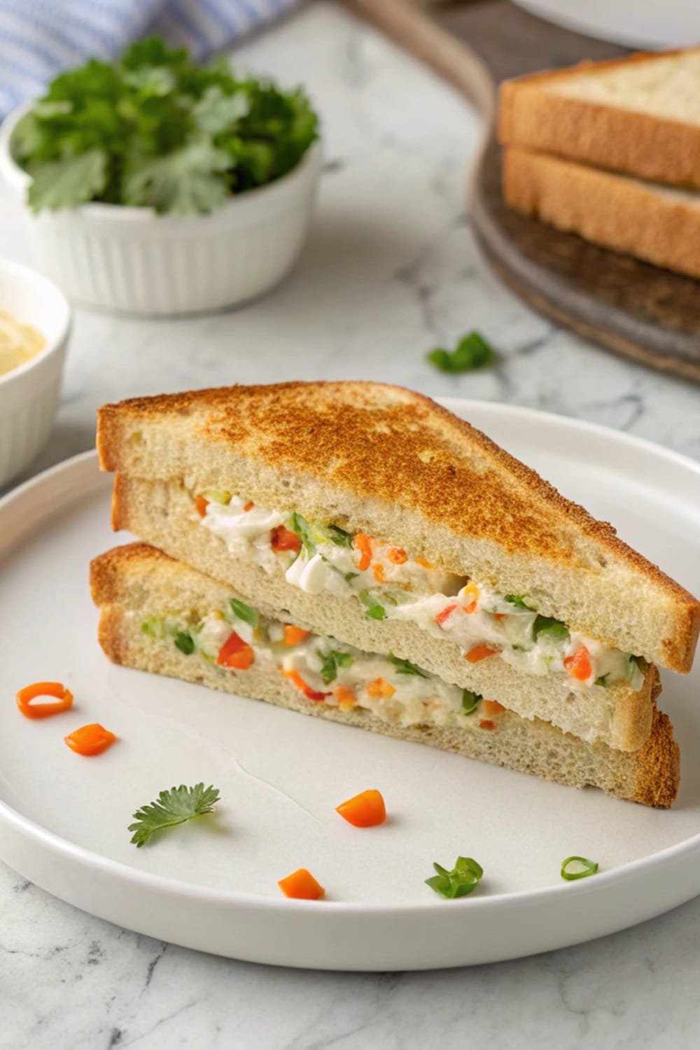 - Spread filling on bread slices, add cheese if desired.