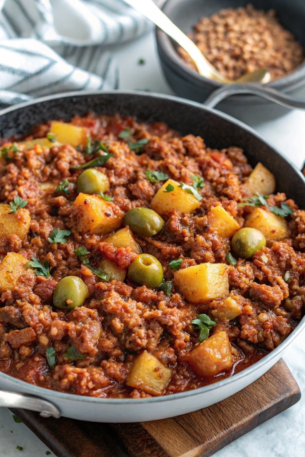 A hearty and flavorful plant based version of a classic, made with sofrito, potatoes, spices, and vegan ground.